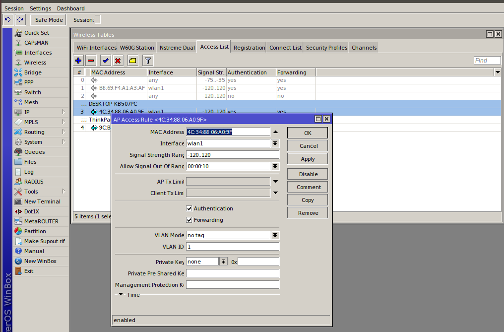 С помощью Wireless Access List можно настроить сложную логику работы клиентов: по уровню сигнала, времени суток, ограничить скорость каждого клиента или загнать его в определенный VLAN без дополнительных телодвижений. Очень рекомендую познакомиться с этим инструментом поближе.