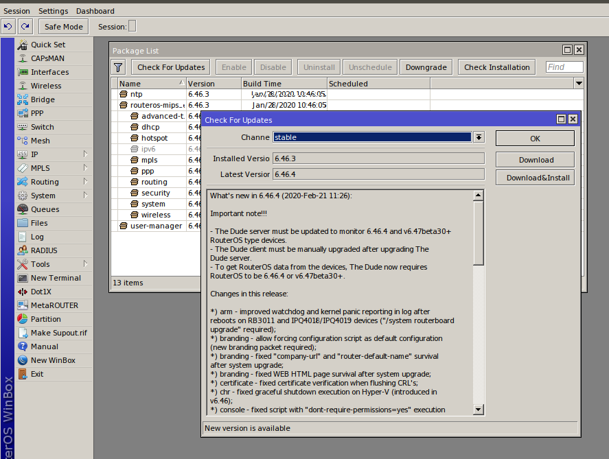 Доступны четыре ветки разработки: Long-term, Stable, Testing и Development. Для критичных систем рекомендуется ставить Long-term. Железка, которая может полежать пару минут в процессе обновления, достойна Stable, остальные ветки оставь для экспериментов на домашнем роутере. Перед обновлением внимательно читай Changelog. Иногда полностью перерабатываются некоторые части ОС, после чего они не способны работать со старой конфигурацией (так было, например, с bridge в 6.41).
