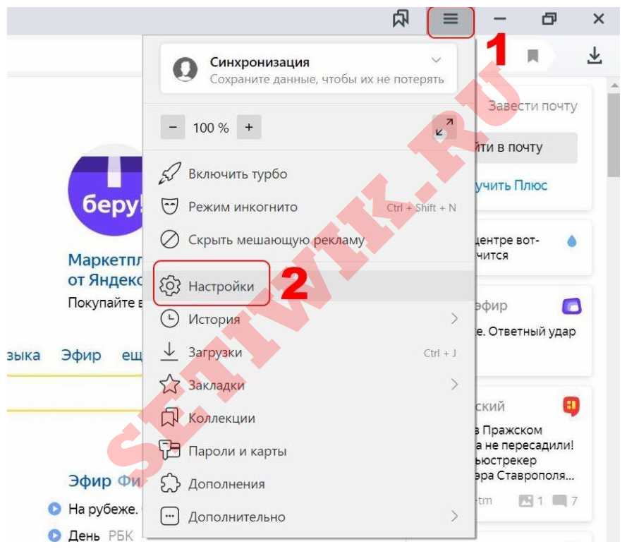- В браузере нажимаем на три полосы в правом верхнем углу и открываем «Настройки».