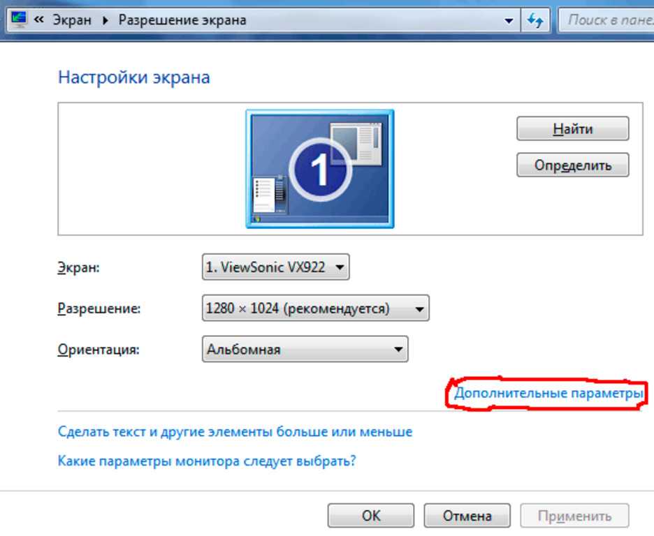 - «Экран» — «Разрешение экрана» — «Дополнительные настройки».