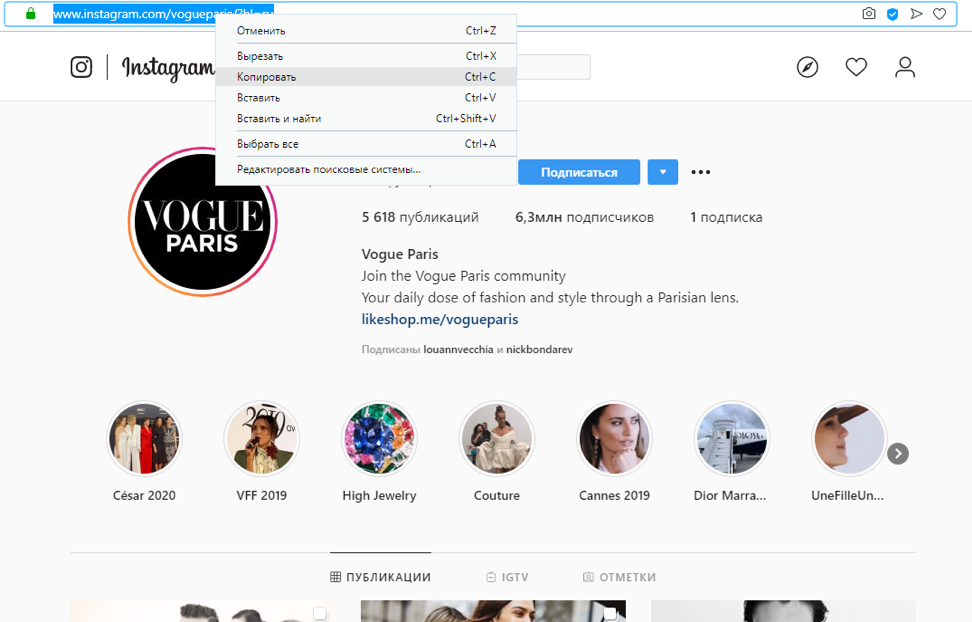 Подобная операция займет у вас не больше трех секунд. Просто зайдите в Instagram с помощью компьютера и перейдите в свой профиль. В строке сверху выделите URL-адрес, затем кликните по нему правой кнопкой мыши и выберите в контекстном меню пункт «Копировать». Дальше просто заходите в диалог с другом и нажимаете Ctrl+V, после чего в текстовое поле вставится ссылка на ваш профиль.