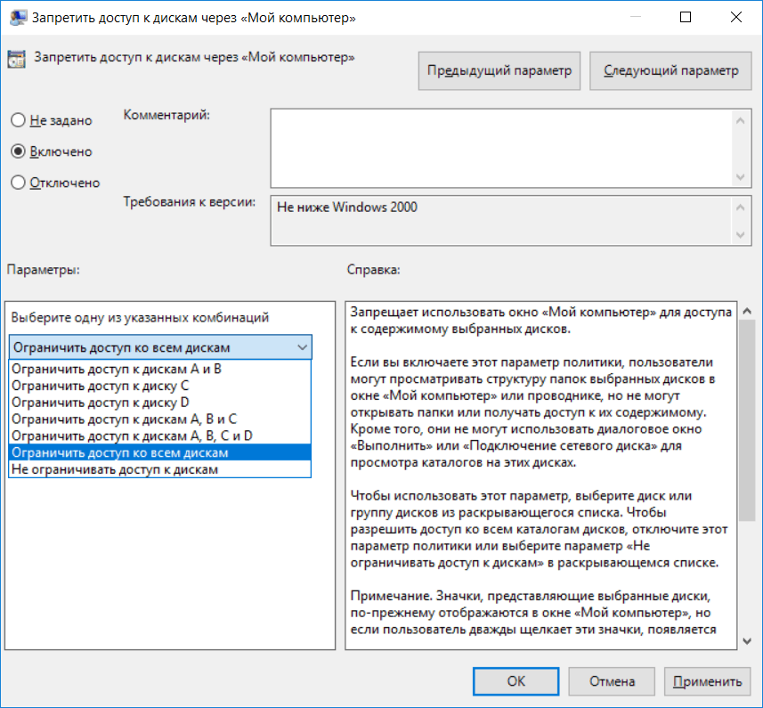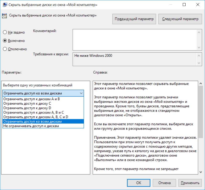 Как видите, есть много полезных и не очень групповых политик в Windows Server 2016. Рассмотрим несколько полезных. Так, Скрыть выбранные диски из окна Мой компьютер (рис. 2) позволяет удалить значки выбранных дисков из окна Этот компьютер (в последних версиях Windows это окно называется именно так).