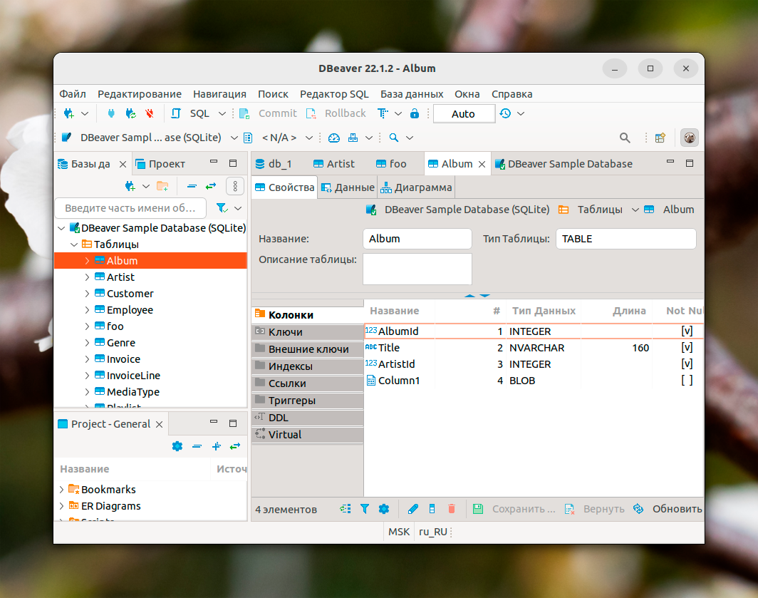 В качестве примера возьмем тестовую базу данных DBeaver, которую разработчики подготовили для ознакомления с возможностями программы. Двойной клик левой кнопкой мыши по любой таблице вызовет страничку с дополнительными сведениями. Во вкладке Свойства отображается ее структура: колонки, ключи, ссылки и т. д.