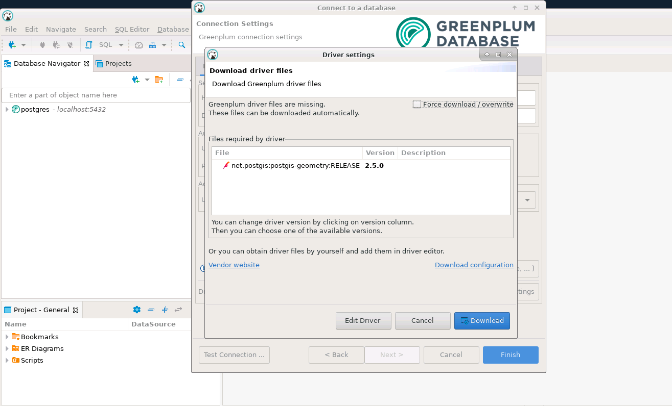 Just like in the image below, you can see that while loading the Greenplum DB it asks to load the required drivers that you can directly download.