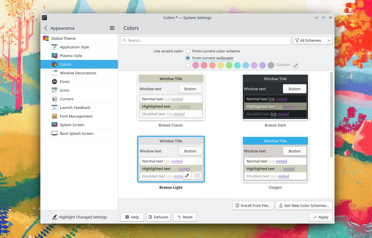 Для адаптации системы под свои нужды служит приложение Параметры системы. В Plasma 5.22 это приложение при запуске открывается на странице Быстрого доступа, которая предоставляет доступ к наиболее популярным и последним часто используемым параметрам. На этой странице также расположена ссылка, перейдя по которой возможно изменить обои рабочего стола и другие параметры общего вида Plasma.
