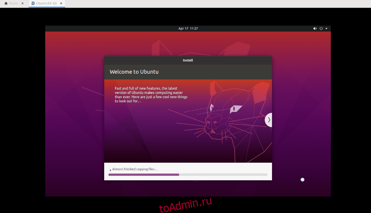 Когда вы нажимаете «Готово», Ubuntu должен немедленно запуститься и начать установку виртуальной машины. Когда установка будет завершена, он будет готов к использованию!