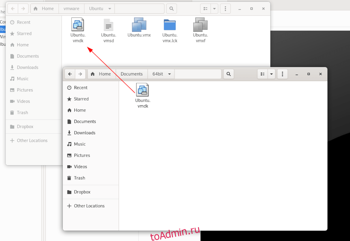 После открытия каталога виртуальной машины удалите Ubuntu.vmdk. Затем откройте второе окно файлового менеджера и перетащите файл Osboxes «Ubuntu.vmdk» (который вы ранее переименовали из «Ubuntu 20.04.2 (64bit) .vmdk» в «Ubuntu.vmdk») в каталог виртуальной машины.