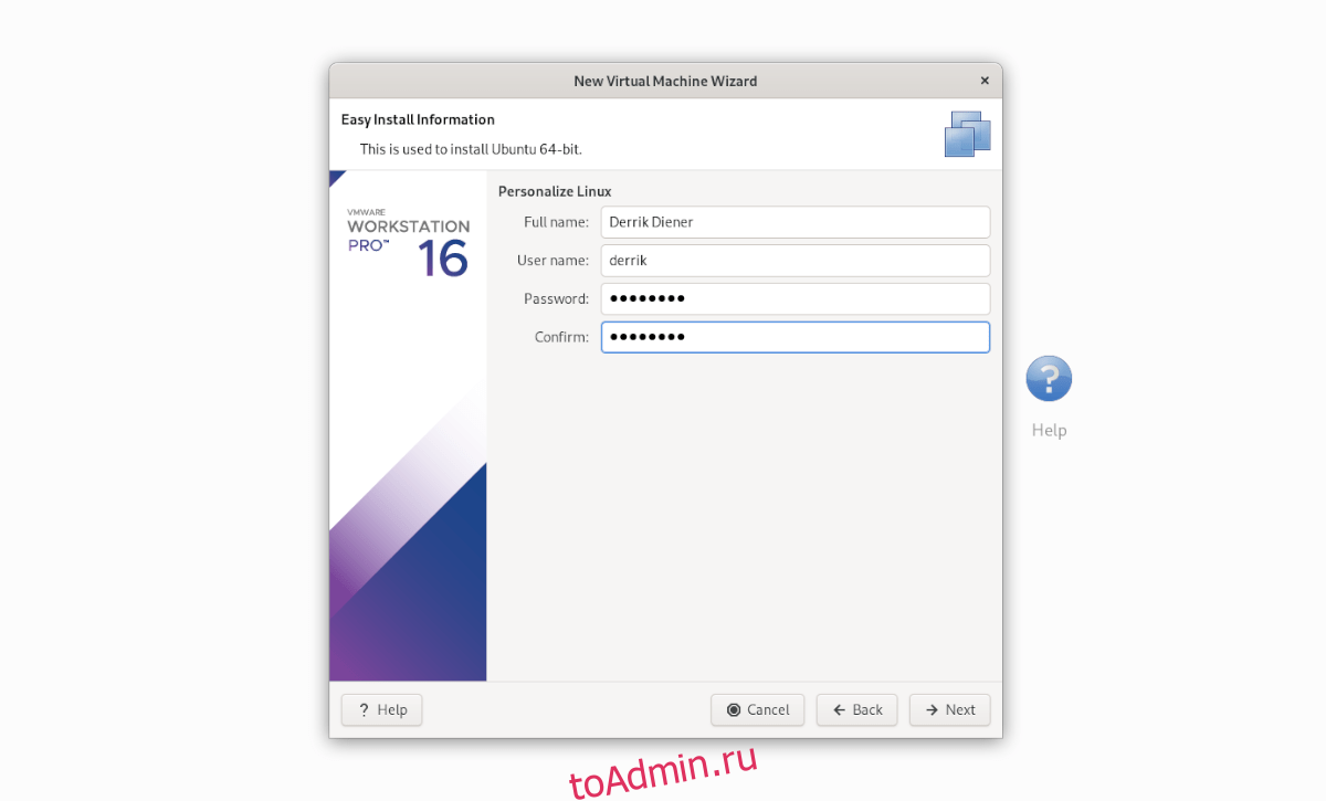 Загрузив ISO-образ в VMware Workstation, вы увидите «Информация о простой установке». На этой странице введите свое полное имя, предпочтительное имя пользователя Ubuntu, а также пароль. В нижнем положении нажмите «Далее».