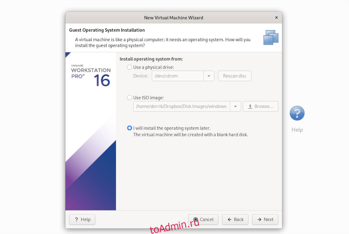 На следующей странице выберите «Я установлю операционную систему позже». Нам не нужно устанавливать ОС, так как она уже настроена на VMDK, который мы загрузили из OSBoxes.
