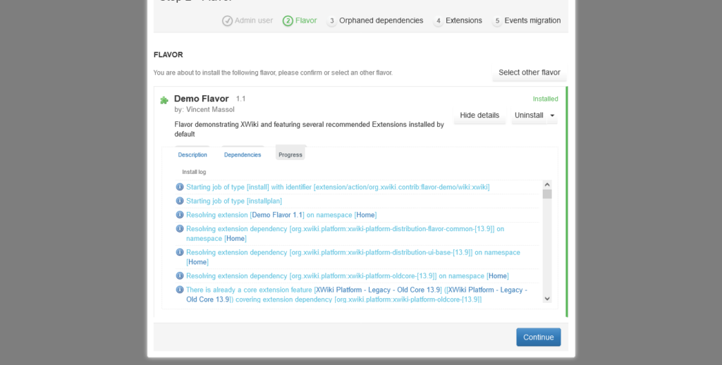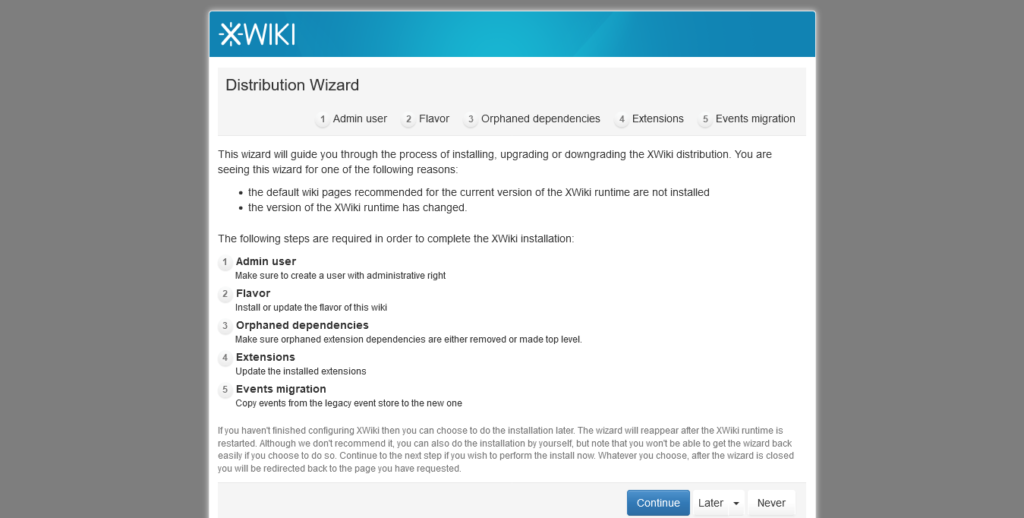 This screen shows you all the steps you need to complete to get XWiki installed. Click Continue.