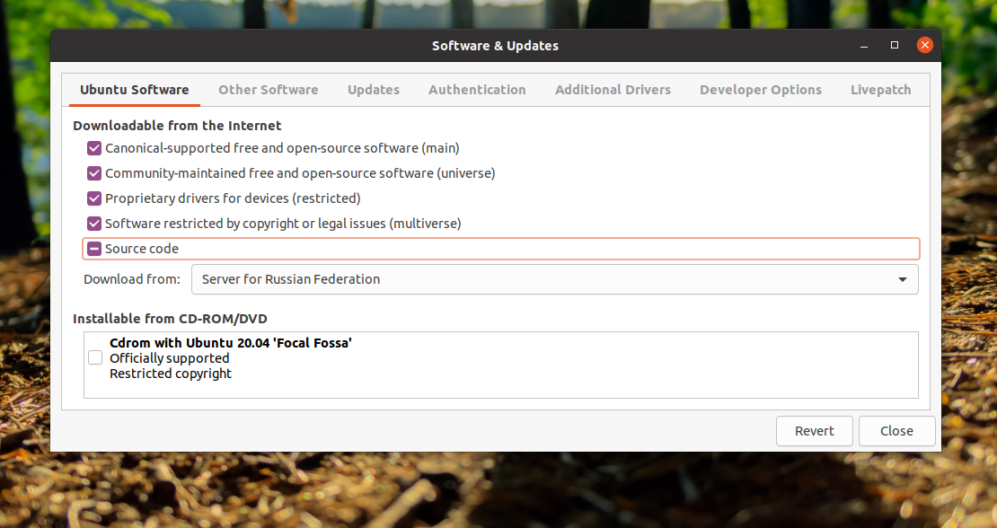 Откройте утилиту Программы и обновления (Software & Updates) и на вкладке Источники ПО (Ubuntu Software) установите галочку напротив пункта Исходный код (Source code):