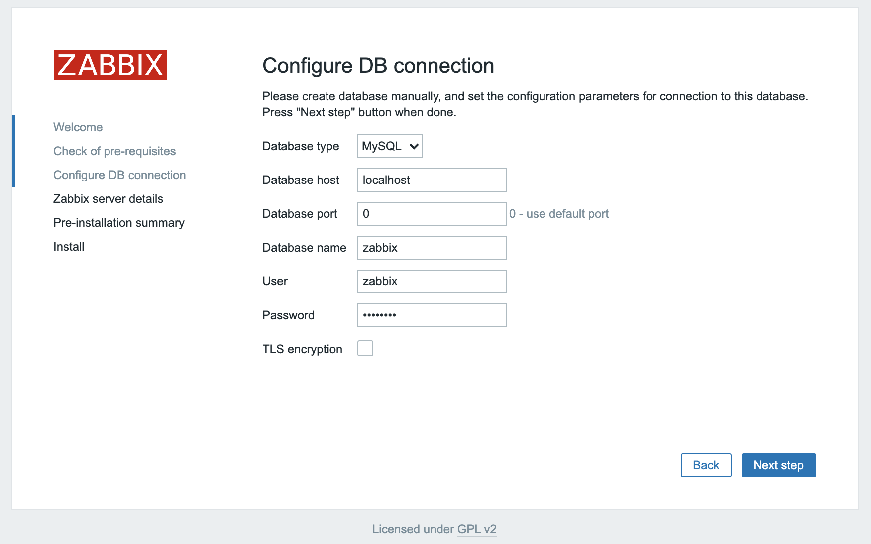 You told the Zabbix server about your database, but the Zabbix web interface also needs access to the database to manage hosts and read data. Therefore enter the MySQL credentials you configured in Step 2. Click Next step to proceed.