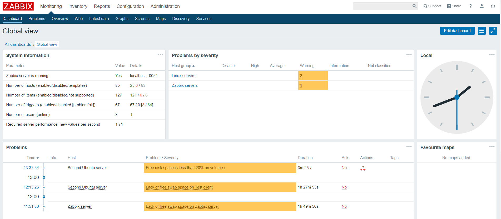 After a minute Zabbix will send the recovery message and the alert will disappear from main dashboard.