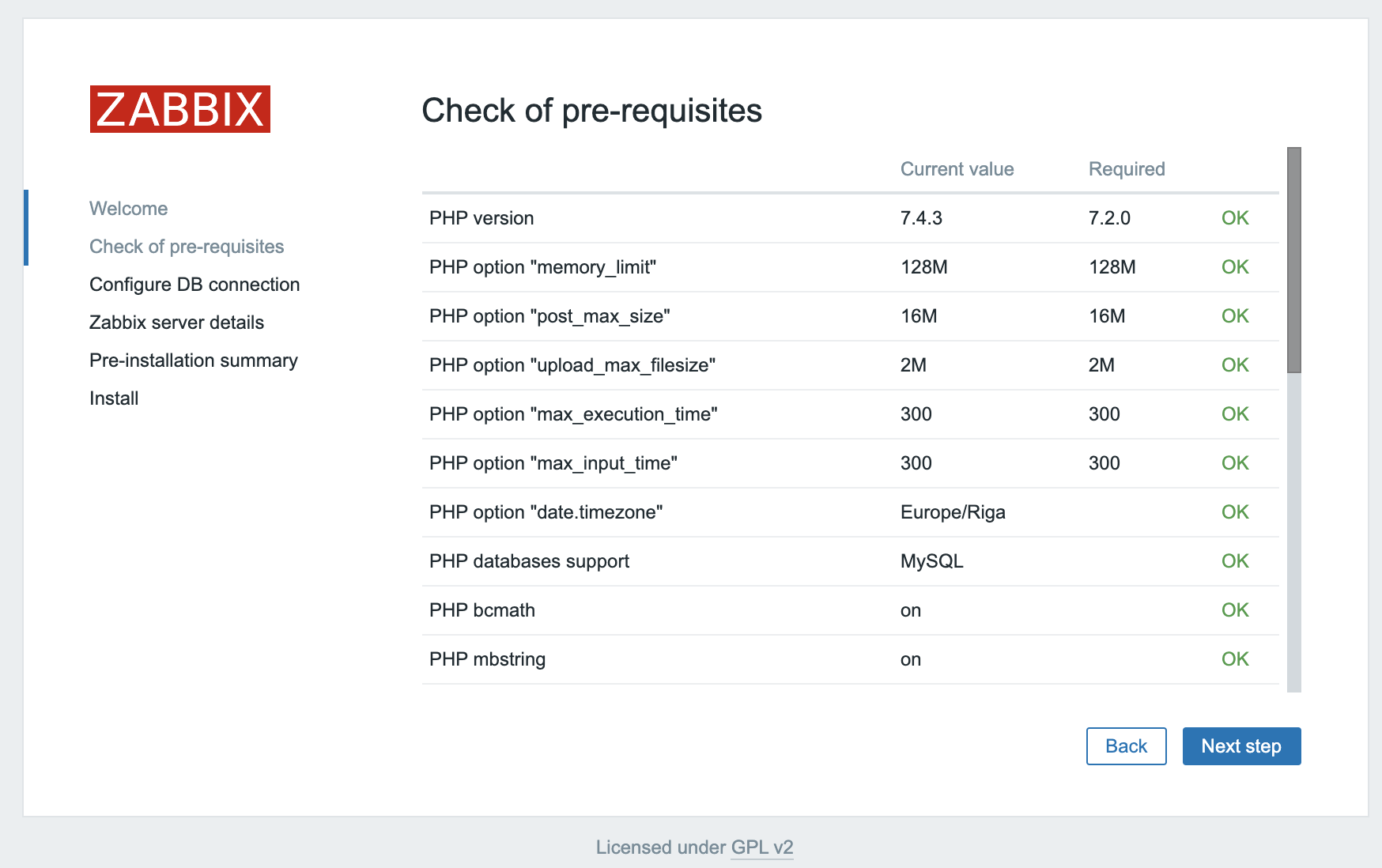 On the next screen, you will see the table that lists all of the prerequisites to run Zabbix.
