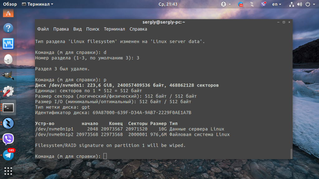 Чтобы удалить раздел выполните команду d, а затем введите его номер: