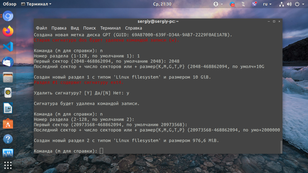 На этом создание разделов fdisk завершено. А вот форматирование разделов в fdisk невозможно, для этого придется воспользоваться утилитой mkfs.