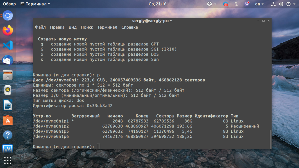 Большинство операций fdisk по разметке дисков выполняются в интерактивном режиме. Чтобы запустить fdisk в интерактивном режиме передайте утилите блочное устройство которое надо разметить. В моём примере, это /dev/nvme0n1: