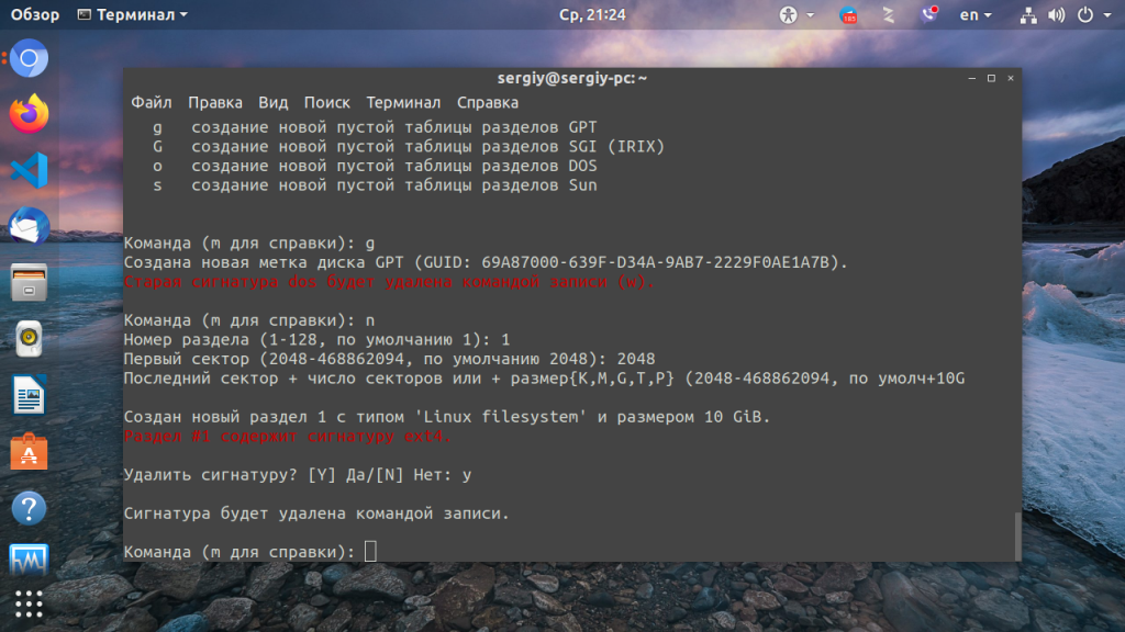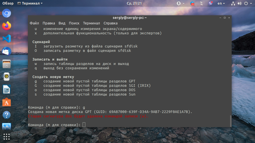 Давайте создадим новую таблицу разделов GPT. Для этого используйте команду g. Для таблицы разделов MBR нам бы понадобилась команда o.