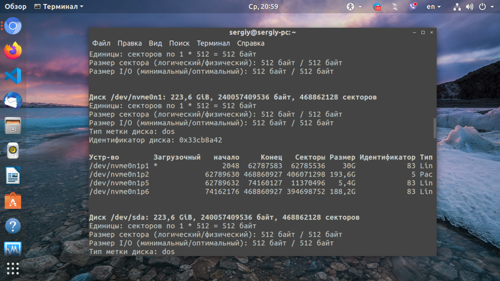 Утилита покажет все блочные устройства. На снимке есть /dev/sda, это обычный жесткий диск и /dev/nvme0n1 — это M.2 накопитель, а также там есть есть несколько /dev/loop* устройств, созданных ядром, которые лучше не трогать.