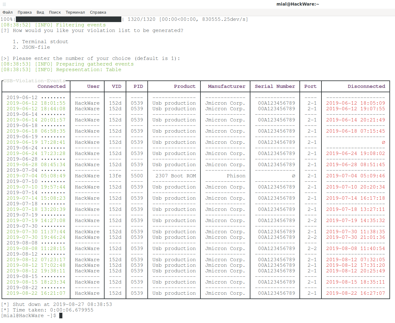Для проверки используется команда usbrip events violations, после которой достаточно указать файл со списком доверенных устройств: