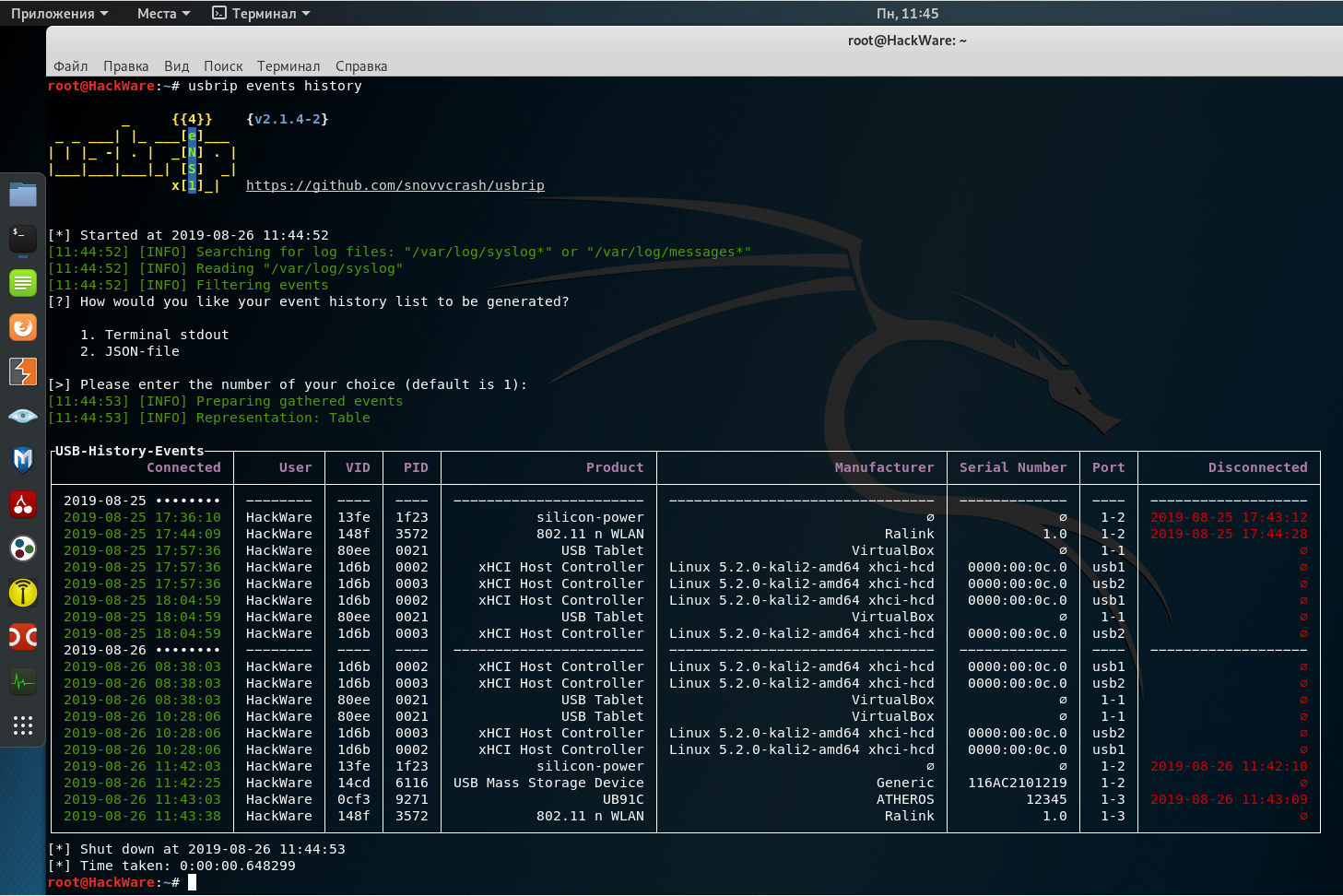 Команда usbrip storage позволяет сохранять/обновлять/просматривать информацию об истории и нарушениях USB устройств. Подробности смотрите в справке https://kali.tools/?p=4873