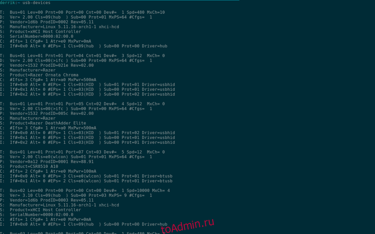 Когда окно терминала открыто и готово к работе, выполните команду usb-devices. Вывод длинный и подробно распечатывается, каждое USB-устройство, подключенное к Ubuntu, в вертикальном списке.