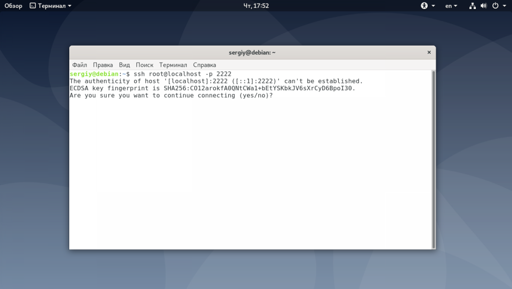 Если пытаетесь подключится через SSH к этому серверу первый раз, то утилита также попросит подтвердить добавление нового устройства в свой список известных устройств, здесь нужно набрать yes и нажать Enter: