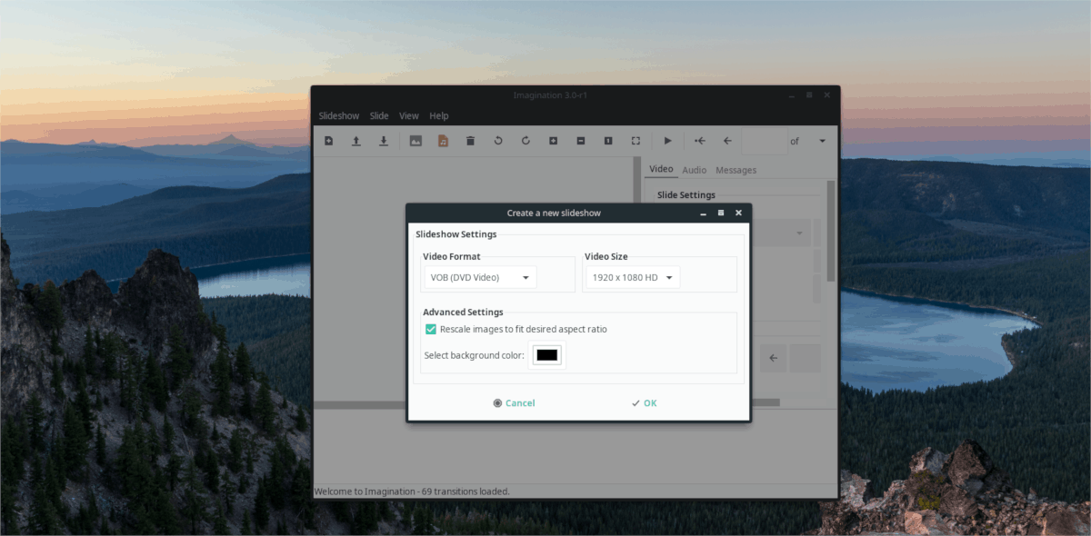 Когда вы нажимаете кнопку «Создать» в Imagination, чтобы начать новое слайд-шоу, вы увидите окно «Создать новое слайд-шоу». Область «Создать новое слайд-шоу» позволяет пользователю настраивать технические характеристики слайд-шоу DVD со всем, от видеоформата (DVD / VOB, FLV или 3GP), разрешения экрана (480p, 576p, 720p, 1080p) и фоновый цвет.