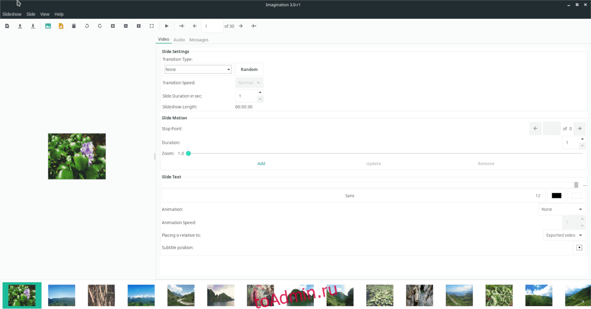 Воображение позволяет пользователю добавлять текст в проекты слайд-шоу. Для этого выберите изображение на шкале времени проекта. Затем перейдите на вкладку «Видео» и напишите текст в поле «Текст слайда».