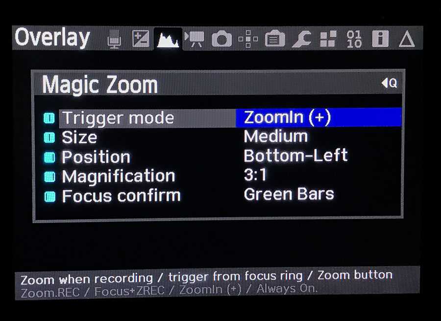 Это – еще одна функция, которая помогает получить резкий фокус в определенном участке кадра. Поддерживается приближение 1:1, 2:1 или 3:1. Magic Zoom можно настроить несколькими способами. Если ее активировать, используя режим Live View, на экране покажется фокусная рамка с выбранным приближением. Затем вы вручную регулируете фокус, достигнув максимальной резкости. Самое крутое – это визуальное подтверждение оптимальной резкости, которое проявляется в виде зеленых прямоугольников над и под фокусным окном.
