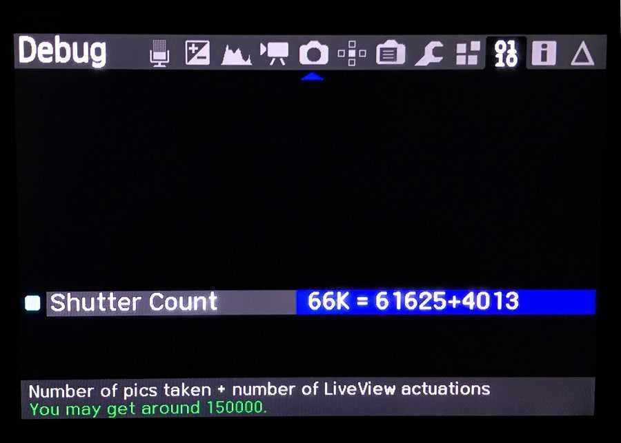 Это маленькая, но удобная функция, хоть и используется не так часто. Не нужно загружать снимок на сайт или в специальное ПО, чтобы посмотреть количество сделанных снимков, оно находится прямо в меню Debug. Вы найдете не только количество срабатываний затвора, но также увидите, сколько из них было в режиме Live View (если это действительно имеет значение). Когда строчка Shutter Count выделена, в нижней части интерфейса даже появляется уведомление о том, сколько всего фотографий можно сделать. Это весьма неплохой штрих.