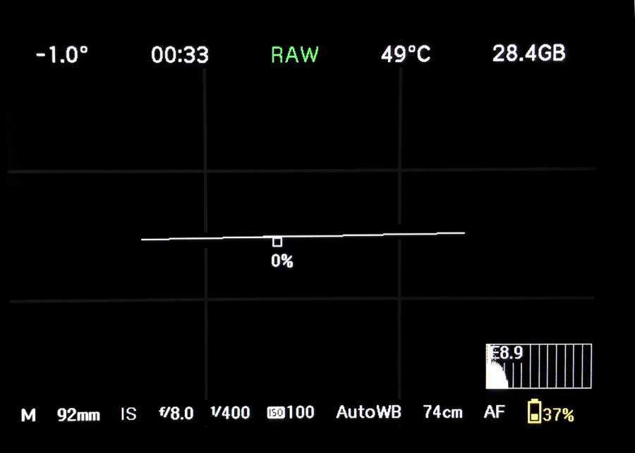 Это тоже не критичная, но хорошая функция. С Magic Lantern, включенным в режиме Live View, на дисплее появляется куча новой информации. Помимо настроек экспозиции отображается режим экспозиции, фокусное расстояние, статус стабилизации изображения, дистанция фокусировки, уровень заряда батареи в процентах, температура камеры и свободное место на карте памяти. Довольно много информации для такого маленького участка.