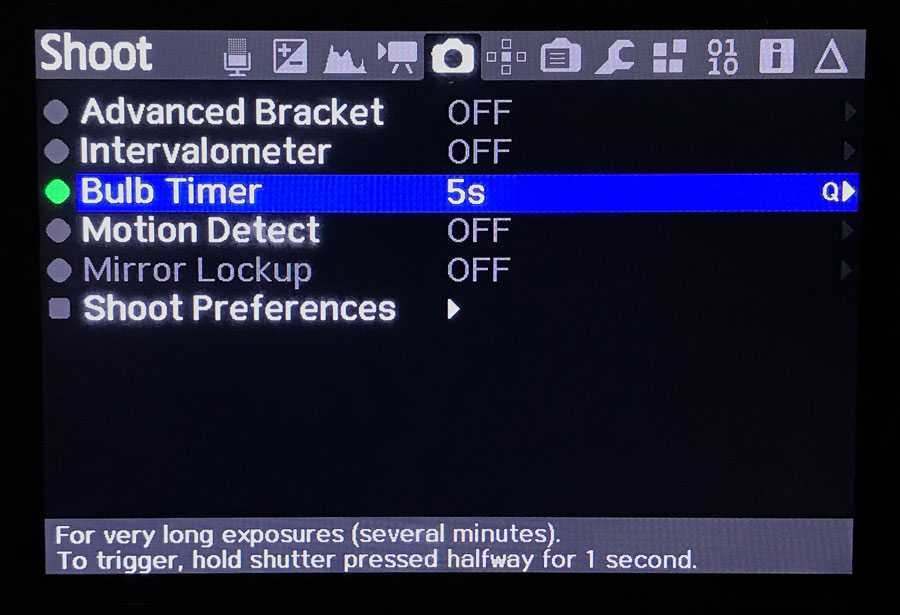 Хотя у моей камеры Canon есть режим «Bulb», для его использования обычно приходится использовать внешнюю кнопку спуска затвора. В качестве альтернативы можно держать нажатой кнопку затвора на камере в течение необходимого времени, но это плохо работает. У Magic Lantern есть функция Bulb-таймера, позволяющая установить выдержку от 1 секунды до 8 часов с шагом в 1 секунду. Активировав эту функцию, нужно наполовину нажать кнопку затвора, чтобы автоматически активировать 2-секундный таймер, после чего камера будет держать затвор открытым в течение выбранного времени. Весьма изящно.
