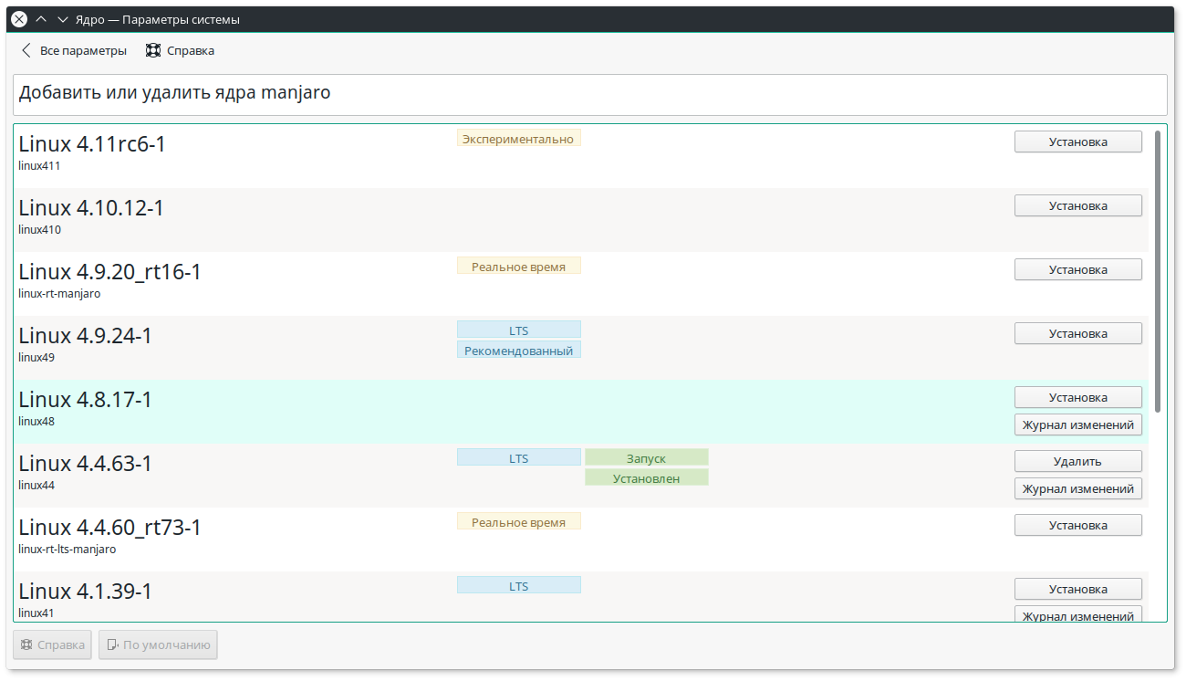 С помощью менеджера настроек также можно выбрать и установить ядро. На выбор дюжина ядер различных версий, в том числе помеченные флагом LTS и самые свежие, но, возможно, нестабильные. Одно из ядер помечено как рекомендуемое и используется по умолчанию при первой установке системы. Присутствует и пара ядер реального времени, обеспечивающих низкую задержку обработки данных, что удобно при работе со звуком.
