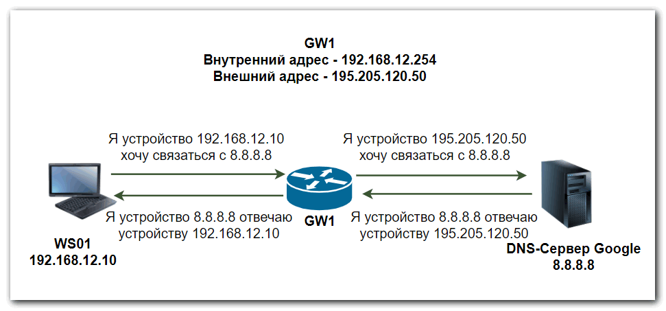 Между основными портами и интернетом в качестве некой «прослойки» установлена служба трансляции сетевых адресов NAT. Она позволяет установить и внутренние, и внешние адреса для компьютеров в одной локальной сети, которые могут не совпадать изначально.