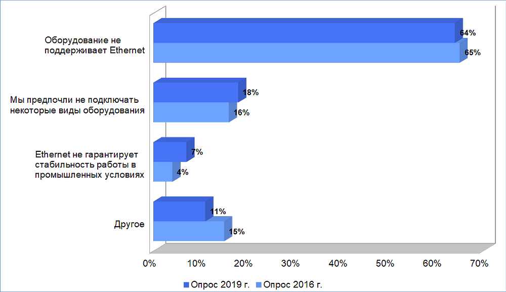 А вот среди предприятий в отраслях, где простои чреваты большими потерями, оказалось наибольшее количество тех, кто внедрил Ethernet раньше других. К таким отраслям, в частности, относятся автомобильная, пищевая, производство товаров народного потребления и нефтегазовая. Многие их представители уже давно завершили переход на Ethernet и, соответственно, сведения о них не нашли отражения в результатах опроса, посвященного планам внедрения. Это и может быть одной из причин того, что цифры кажутся низкими.