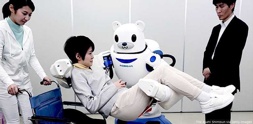 Известный пример робота для ухода за больными и пожилыми людьми – японский Robear. Его основная задача – помощь в перемещении. Он способен поднимать и бережно переносить людей. За «нежность» прикосновений отвечает высокочувствительный датчик Smart Rubber.
