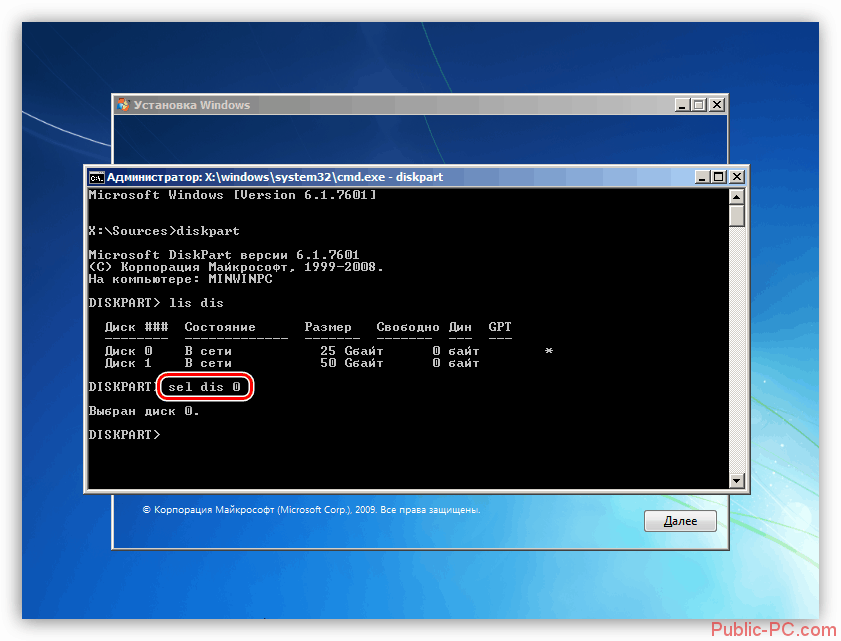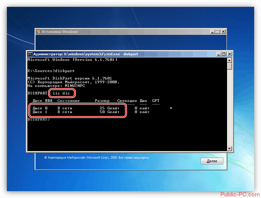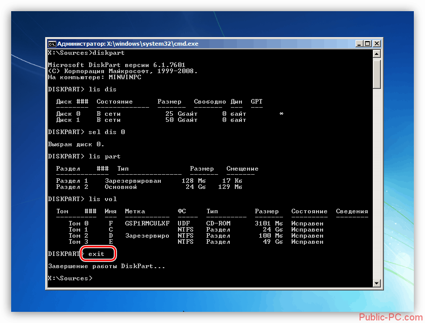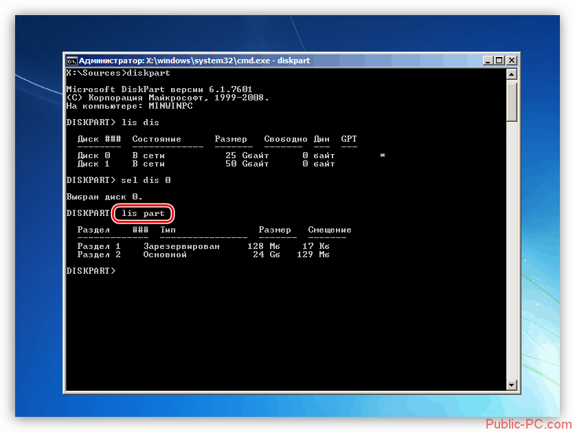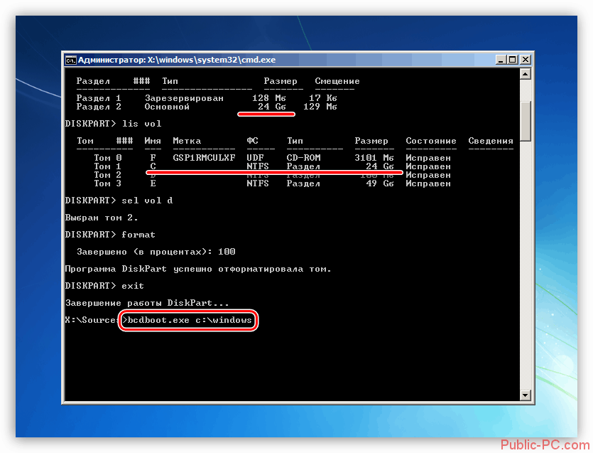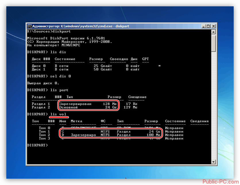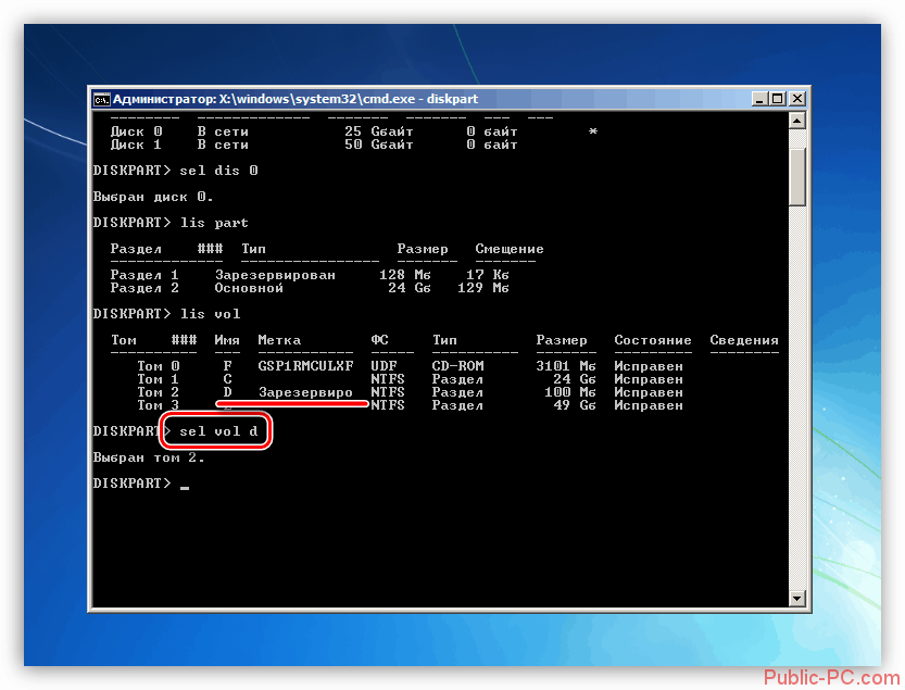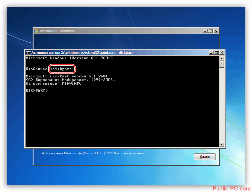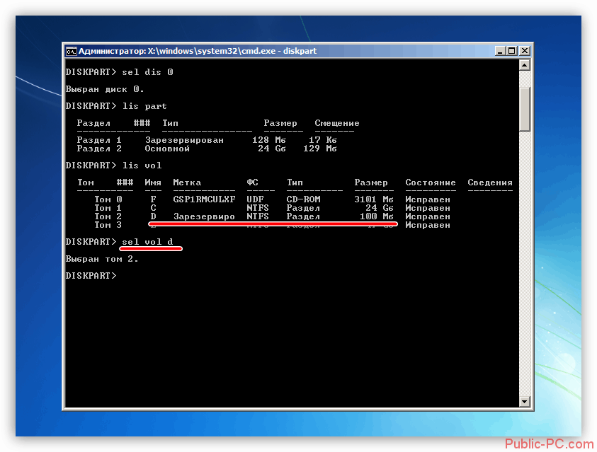 Такое случается опять же по вине неверных действий пользователя. Вернуть все как было поможет консоль восстановления Windows и утилита DiskPart. Для её запуска надо в командной строке ввести команду diskpart: