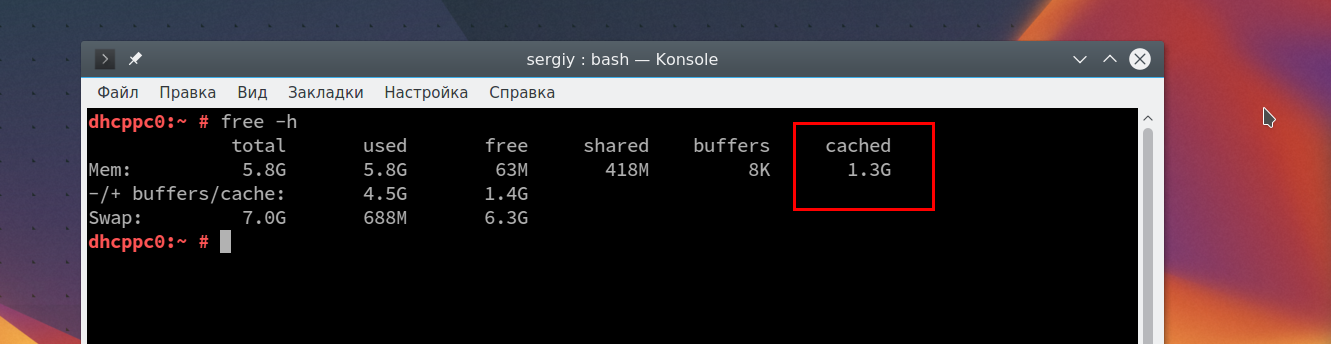Посмотреть размер страничного кэша можно с помощью утилиты free. Здесь он показан в последней колонке — cached: