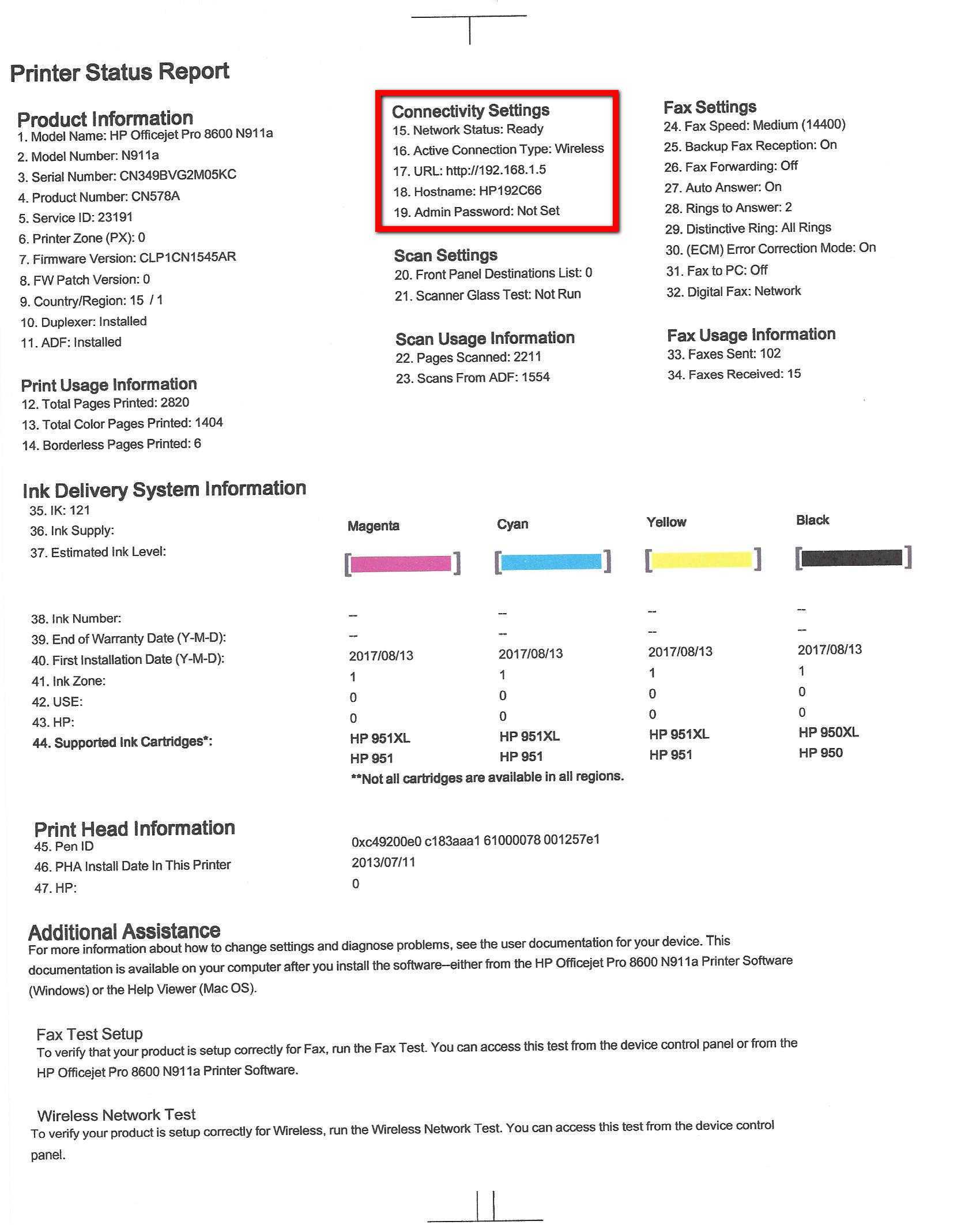 В итоге выйдет лист, на котором могут отображаться не только системные данные о состоянии печатной техники. Нередко распечатываются и цветные элементы с символами разных размеров для проверки качества оттиска. Ниже предоставлен пример отчета для модели HP Officejet Pro 8600 N911a.