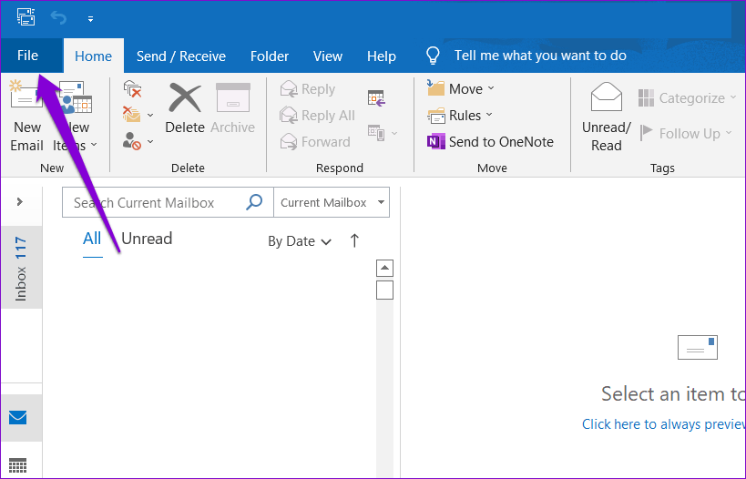 Шаг 1. В приложении Outlook щелкните меню «Файл» в верхнем левом углу.