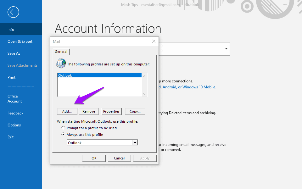 Перейдя в окно настройки почты, выполните следующие действия, чтобы удалить все профили Outlook: