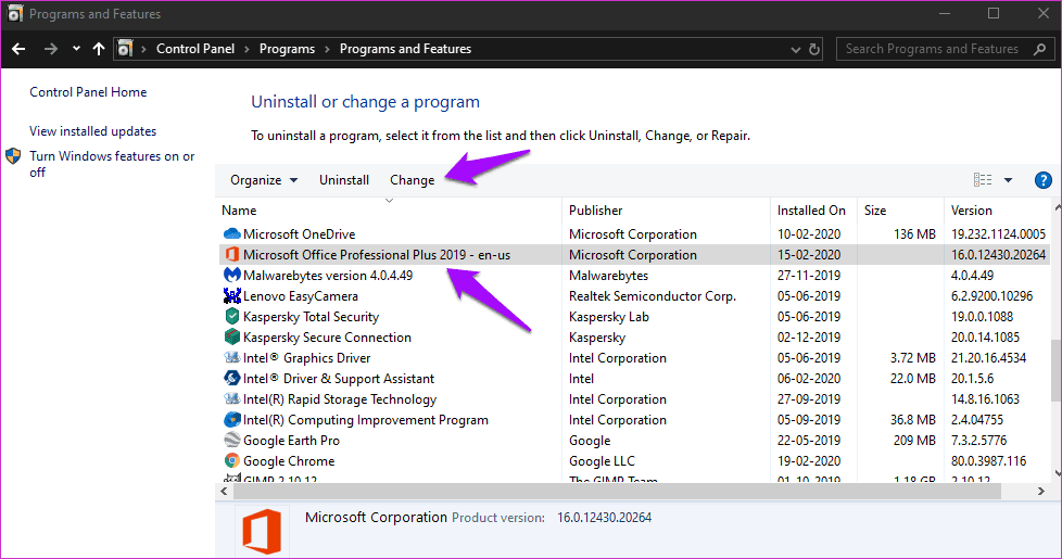 Найдите отдельное приложение Outlook, если вы установили его или версию пакета Microsoft Office. Выберите его и нажмите кнопку «Изменить» вверху.