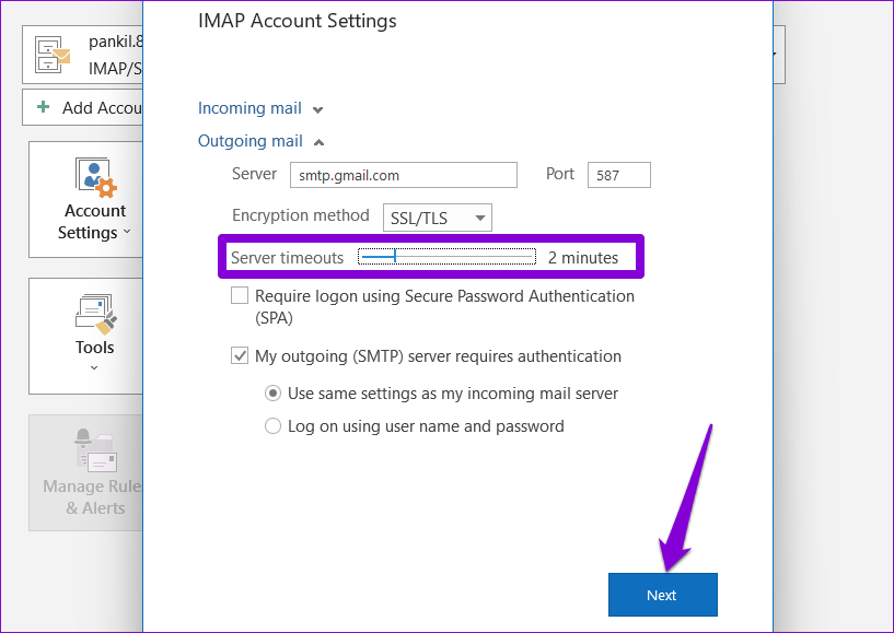 Шаг 3: В разделе «Исходящая почта» измените значение порта на 587.
