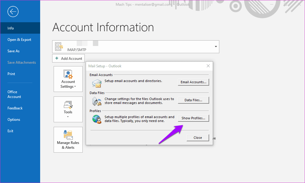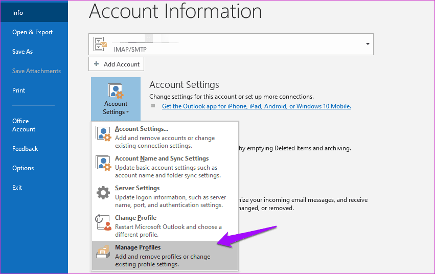 Откройте Outlook и в меню «Файлы» нажмите «Настройки учетной записи» > «Управление профилями».