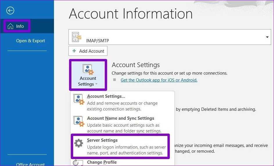 Шаг 2. На вкладке «Информация» разверните «Настройки учетной записи» и выберите «Настройки сервера».
