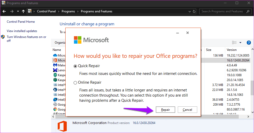 Вы увидите всплывающее окно с двумя вариантами. Быстрое восстановление будет работать в автономном режиме и исправит наиболее распространенные ошибки. Попробуйте это в первую очередь. Если это не работает, попробуйте онлайн-восстановление.