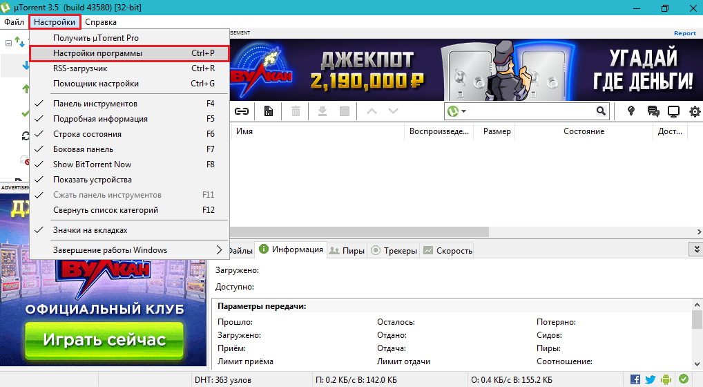 Шаг 1. Запустите свой торрент-клиент и перейдите в его настройки. В программе uTorrent это можно сделать, нажав на раздел меню «Настройки» в верхней части экрана и выбрав пункт «Настройки программы. Также можно использовать комбинацию горячих клавиш «Ctrl+P».