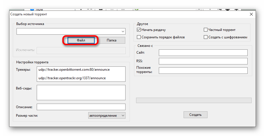 - В торрент-программе зайдите по пути «Файл» — «Создать новый торрент…» или зажмите комбинацию клавиш Ctrl+N.