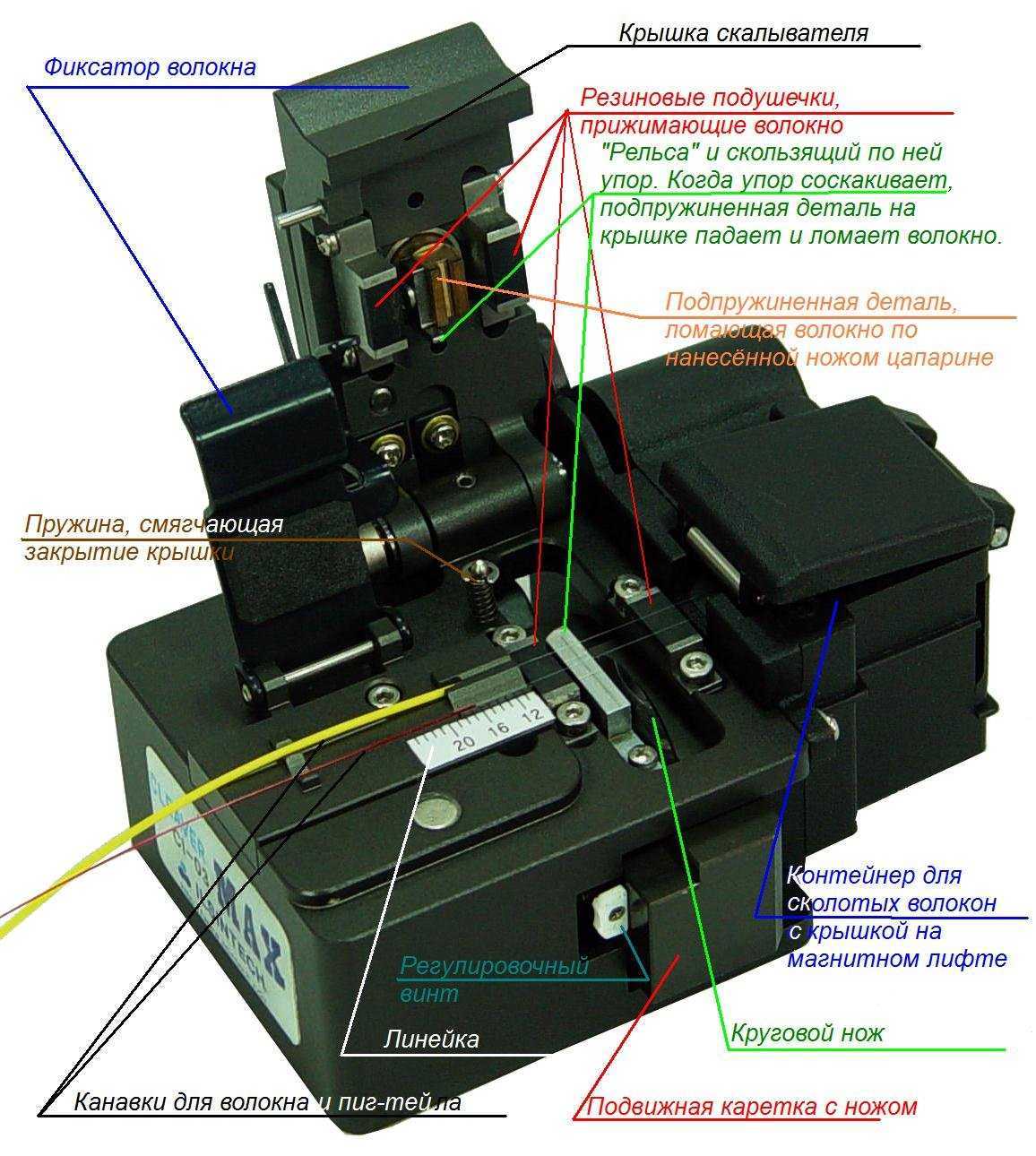 Скалыватель —это механическое высокоточное устройство. Основное назначение — создать как можно более плоскую и перпендикулярную оптоволокну поверхность скола.